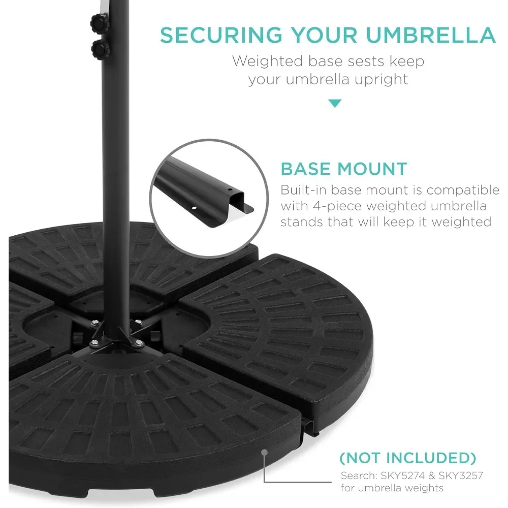 10FT SOLAR-POWERED UMBRELLA: Designed with 24 built-in LED lights powered by solar panels on top of its pole, this offset umbrella saves energy while maintaining perfect lighting in the day and night; covers more space than traditional patio umbrellas EASY ADJUSTMENT: A hand-crank lift and easy-tilt system allow you to adjust the shade and block the sun at all angles, keeping the area protected throughout the day; detachable pole and crank also make for easy setup and storage ENHANCED STABILITY: A large wind vent allows cool air to flow through, while the cross base, 4 included ground stakes, and an extra pole knob add optimal support; Note: Do not use without umbrella base weights. Recommended weight: 100lbs or more. DURABLE COMPOSITION: Crafted with a powder-coated steel pole to prevent oxidation and scratching, plus a water-resistant polyester fabric shade for years of vibrance VERSATILE SHADE: Perfect for outdoor parties, weddings, and get-togethers! Pairs perfectly with our signature 4-Piece Offset Umbrella Base Stand (Search: B06X9PLTY5, B09F7T2Y6L, B09PFBR1XN; SOLD SEPARATELY); OVERALL DIMENSIONS: 120"(Dia) x 84"(H)