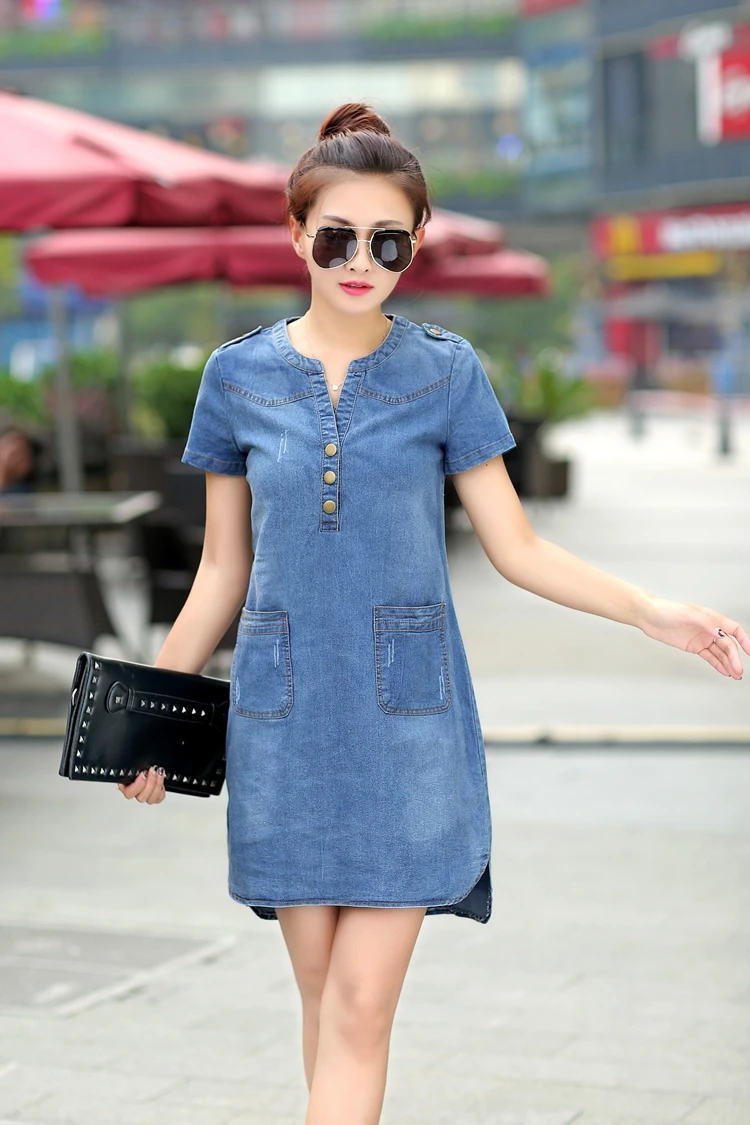 2025 New arrival summer women denim dresses short sleeves loose A word dresses v-neck solid denim dresses