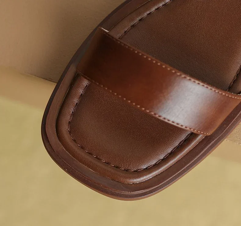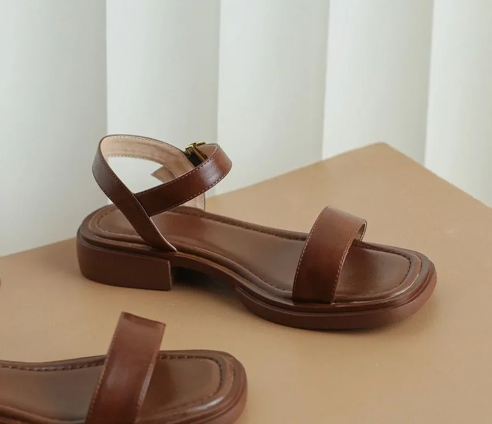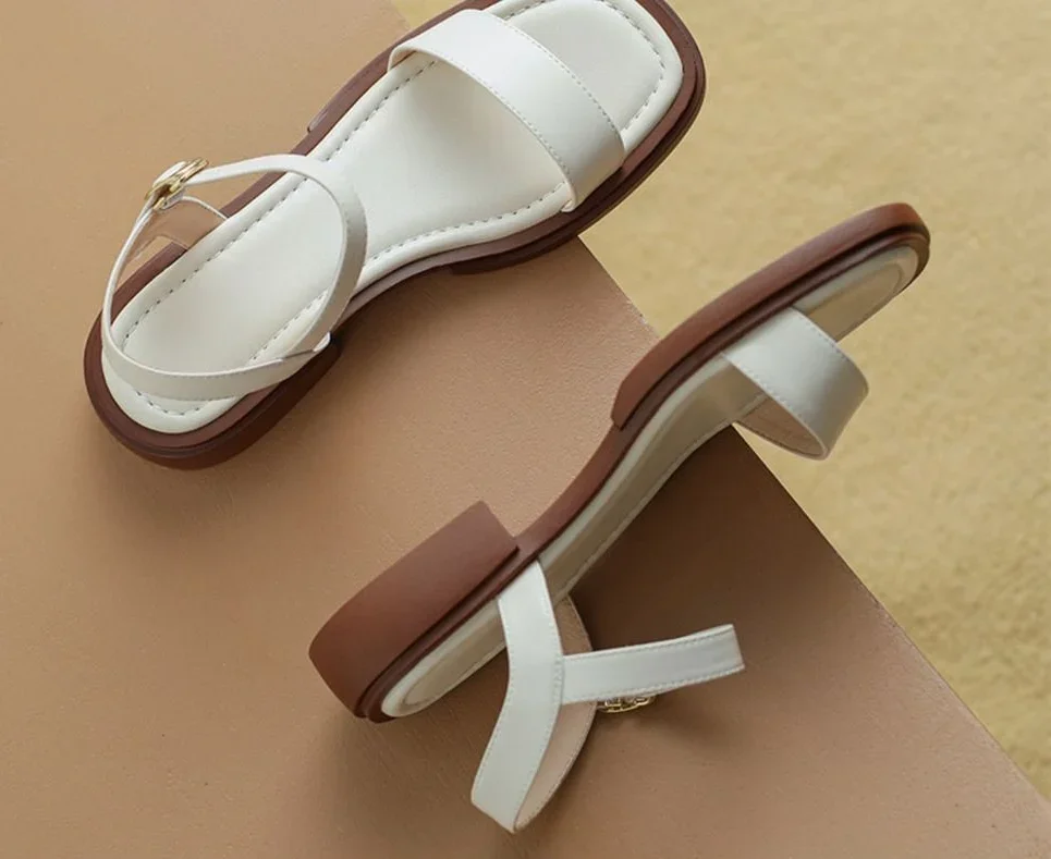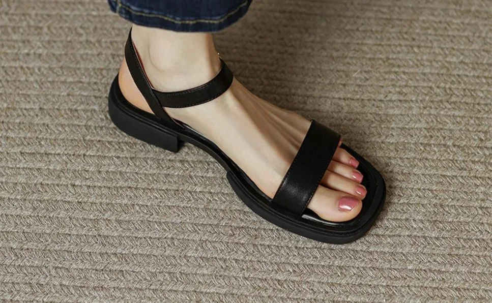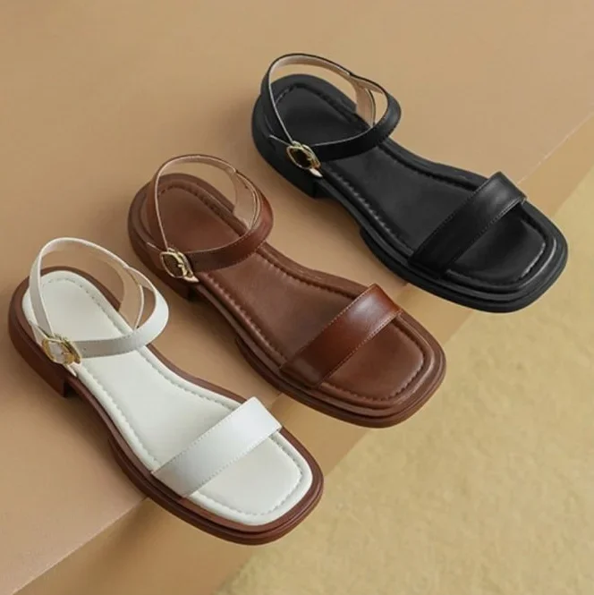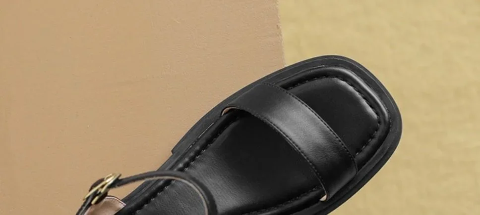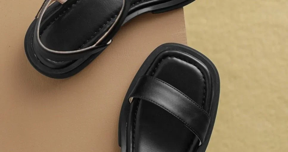 Black Sandals for Woman with Strap Summer 2024 Footwear Outdoor Women's Shoes Flat Leather One Word Comfort Korea Designer Trend