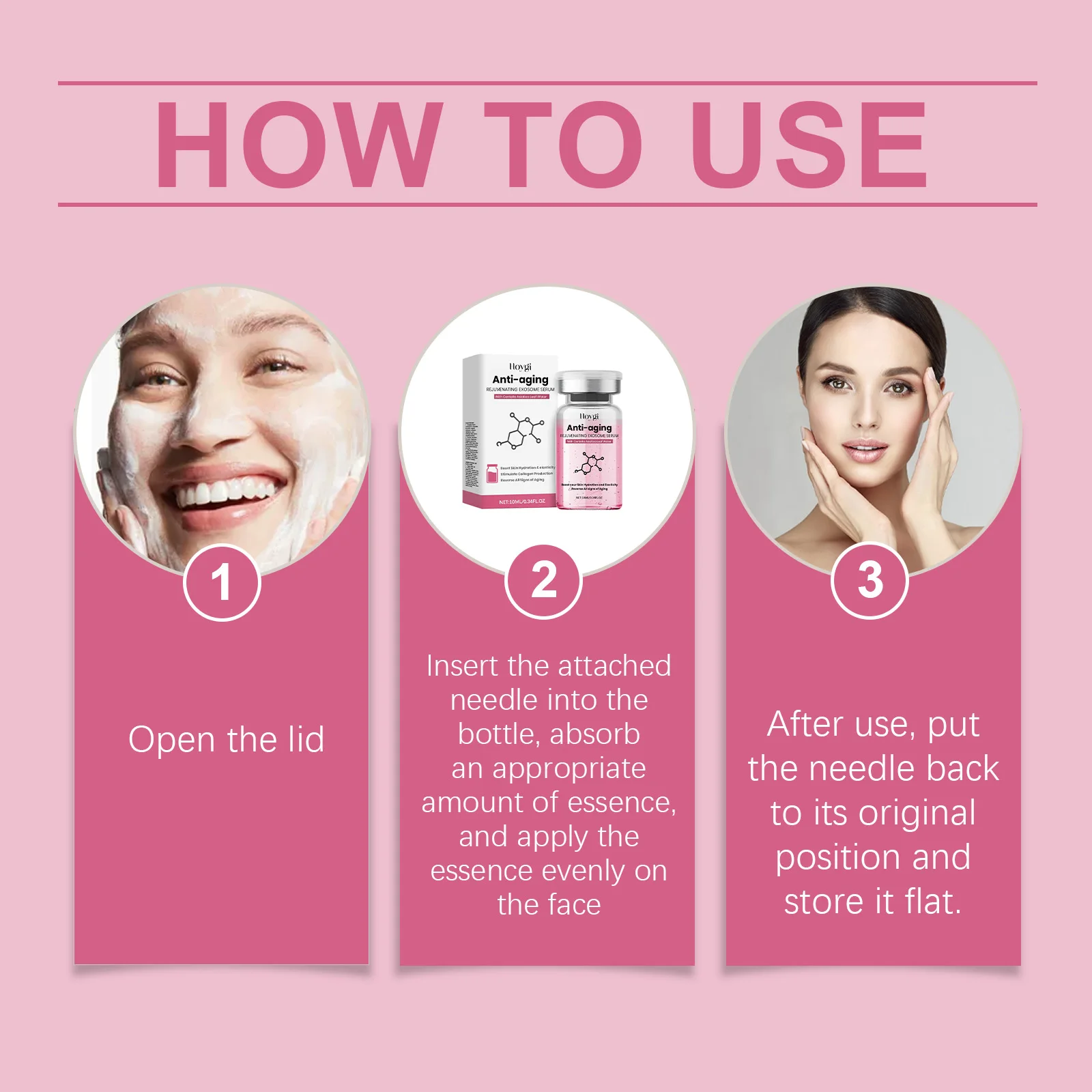 2. Insert the attached needle into the bottle, absorb an appropriate amount of essence. and apply the essence evenly on the face
