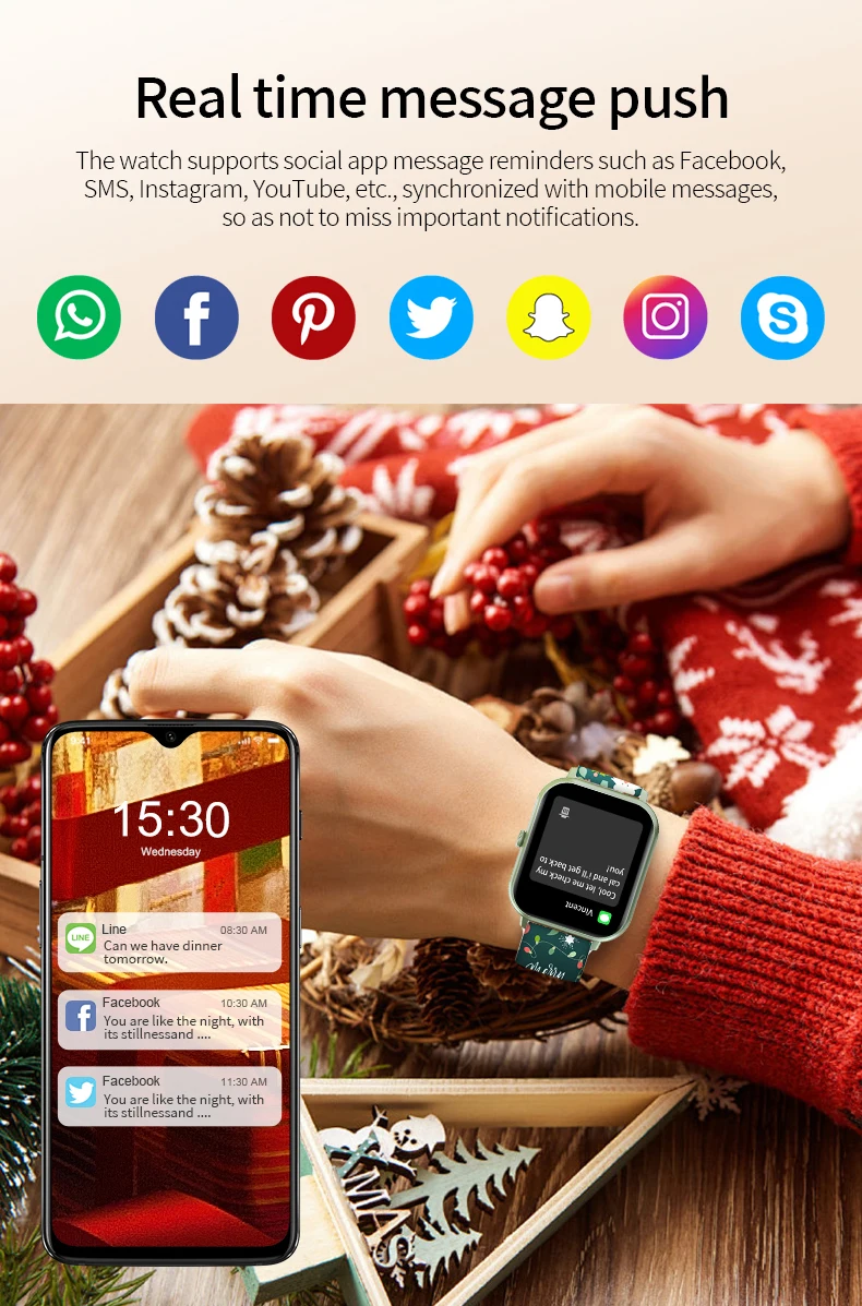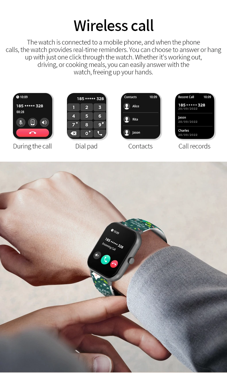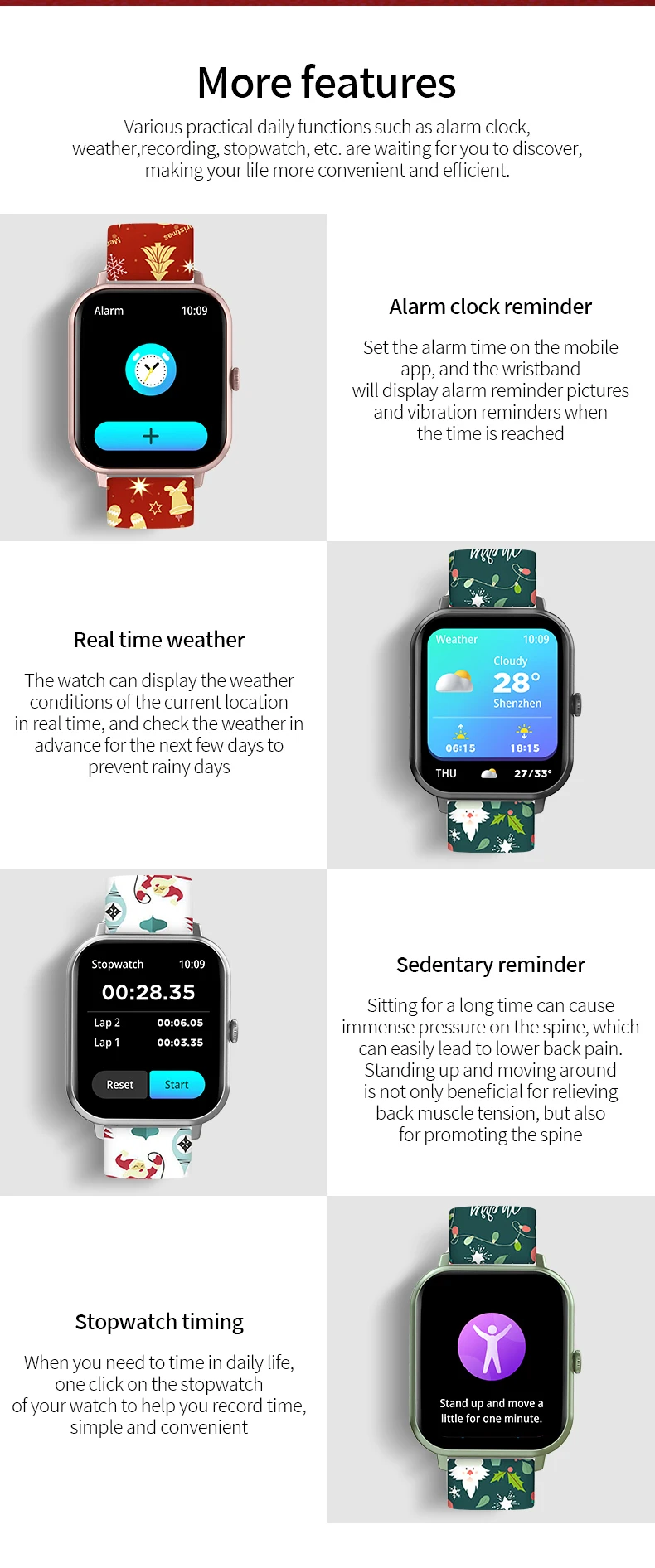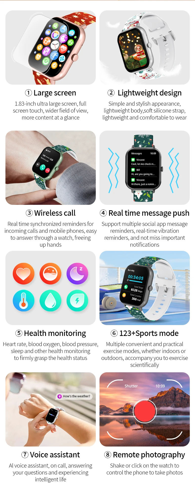 Bluetooth call,Heart rate/blood pressure monitoring, time/date display, steps, distance, calories, sleep monitoring, call reminder, social APP message reminder, sedentary reminder, information reminder There are function enable switches on the APP side (incoming call, SMS, Wechat, QQ, Facebook, Twitter, LinkedIn, WhatsApp, Line, Instagram, Snapchat, Skype and other mobile phone applications) remotely take pictures, raise the wrist to brighten the screen, switch the format, stopwatch, find the phoneBracelet brightness adjustment