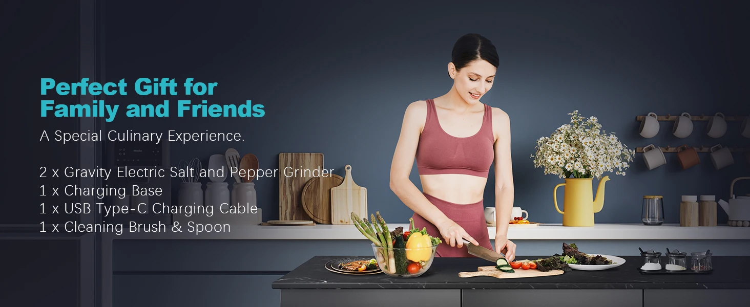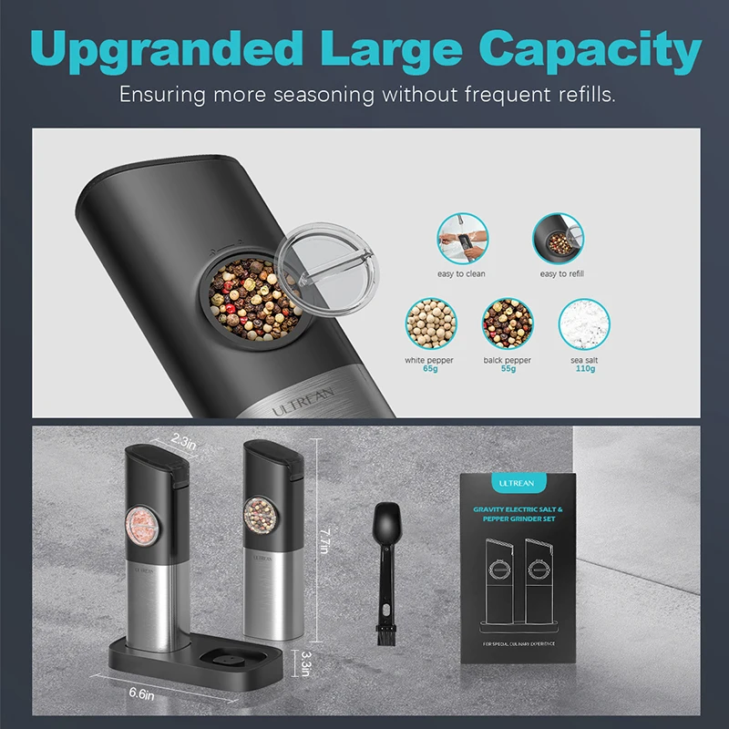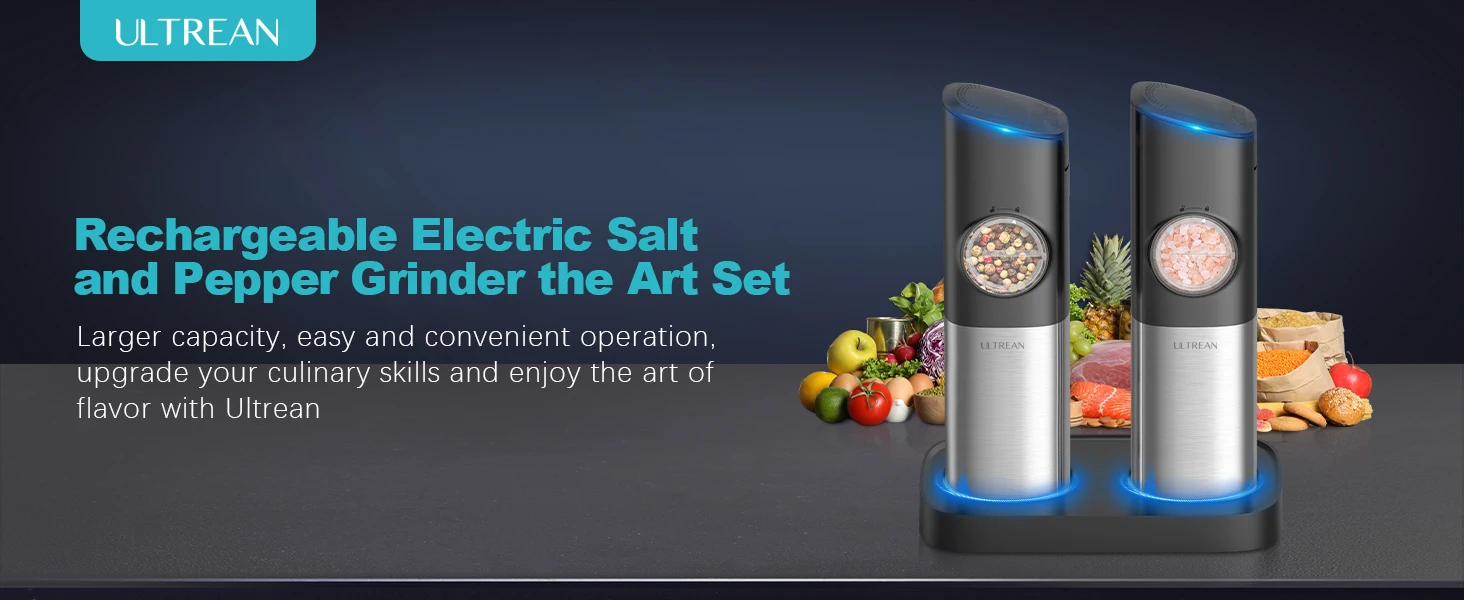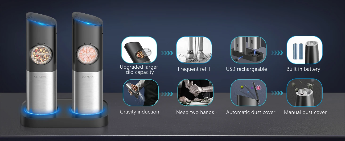 ULTREAN Salt and Pepper Grinder Electric Stainless Steel Salt Pepper Mills with Adjustable Fineness Auto Dust Lids Kitchen Tool